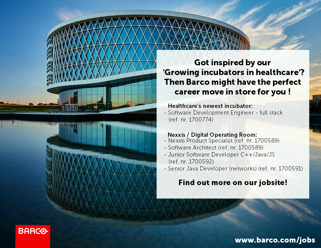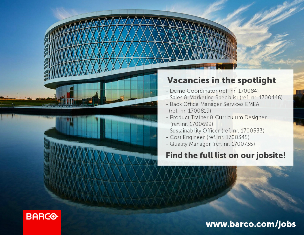 We were very excited to see so many attendants for our "Behind the screens" event focusing on innovation & career opportunities. We hope you gained some insights in how we, as a top notch technology company, put innovation into practice. Got inspired by one of our key-note speakers or the Barco story in general? Then we just might have your next career move in store!Check out our current career opportunities in the spotlight below or visit www.barco.com/jobs for the full list! |